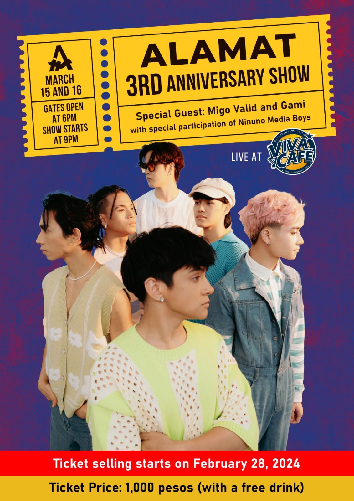 ALAMAT 3rd Anniversary Show ππΌπ€ LIVE at the VIVA CAFE March 15 and 16 with special guests! π₯° Ticket price: 1000 pesos (with free drink) Ticket selling starts on February 28. Stay