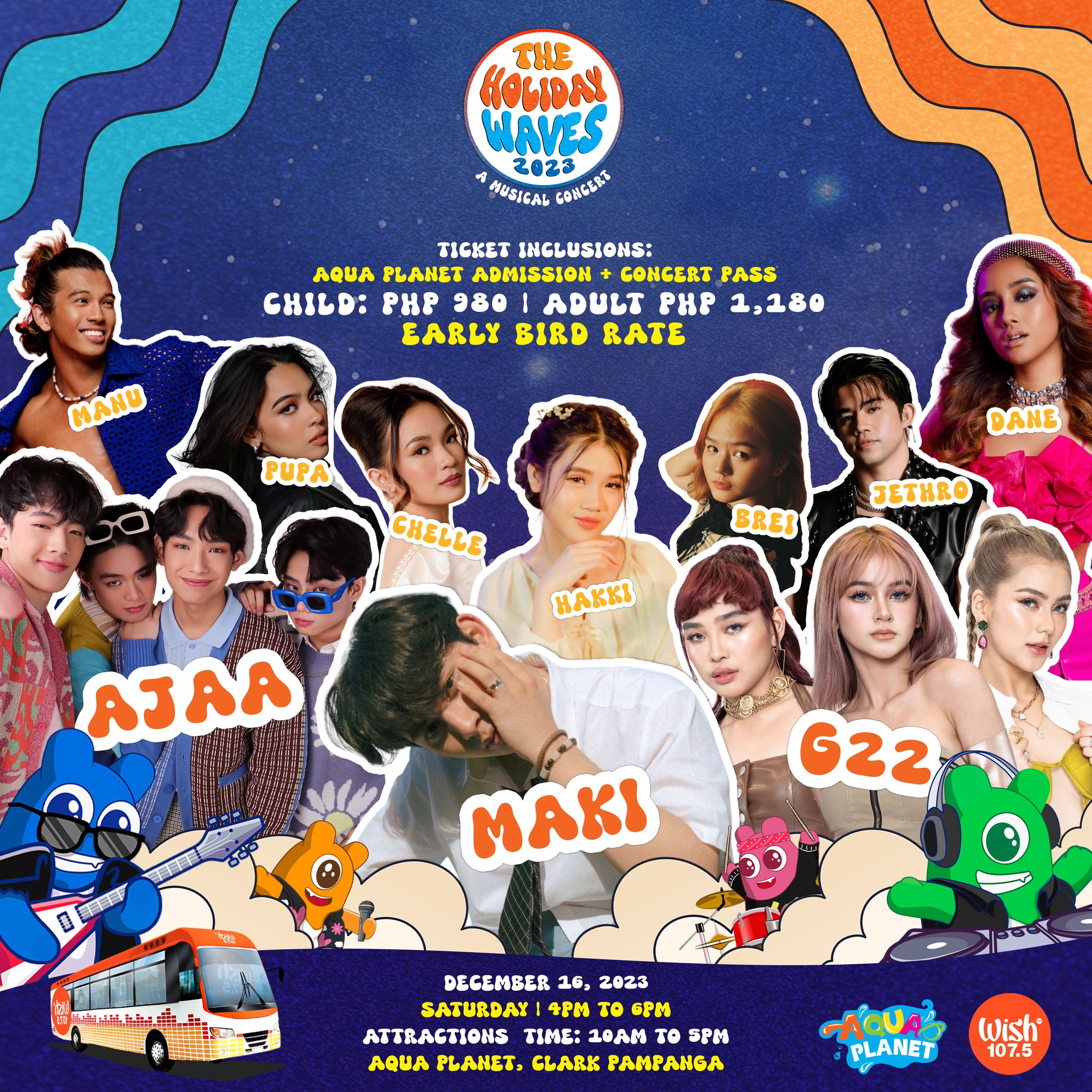 “Aqua Planet: The Holiday Waves” concert! Prepare for a one-of-a-kind concert experience on December 16, 2023, at 4 p.m., at Aqua Planet, Clark, Pampanga, featuring OPM acts G22, Maki, Hakki, and