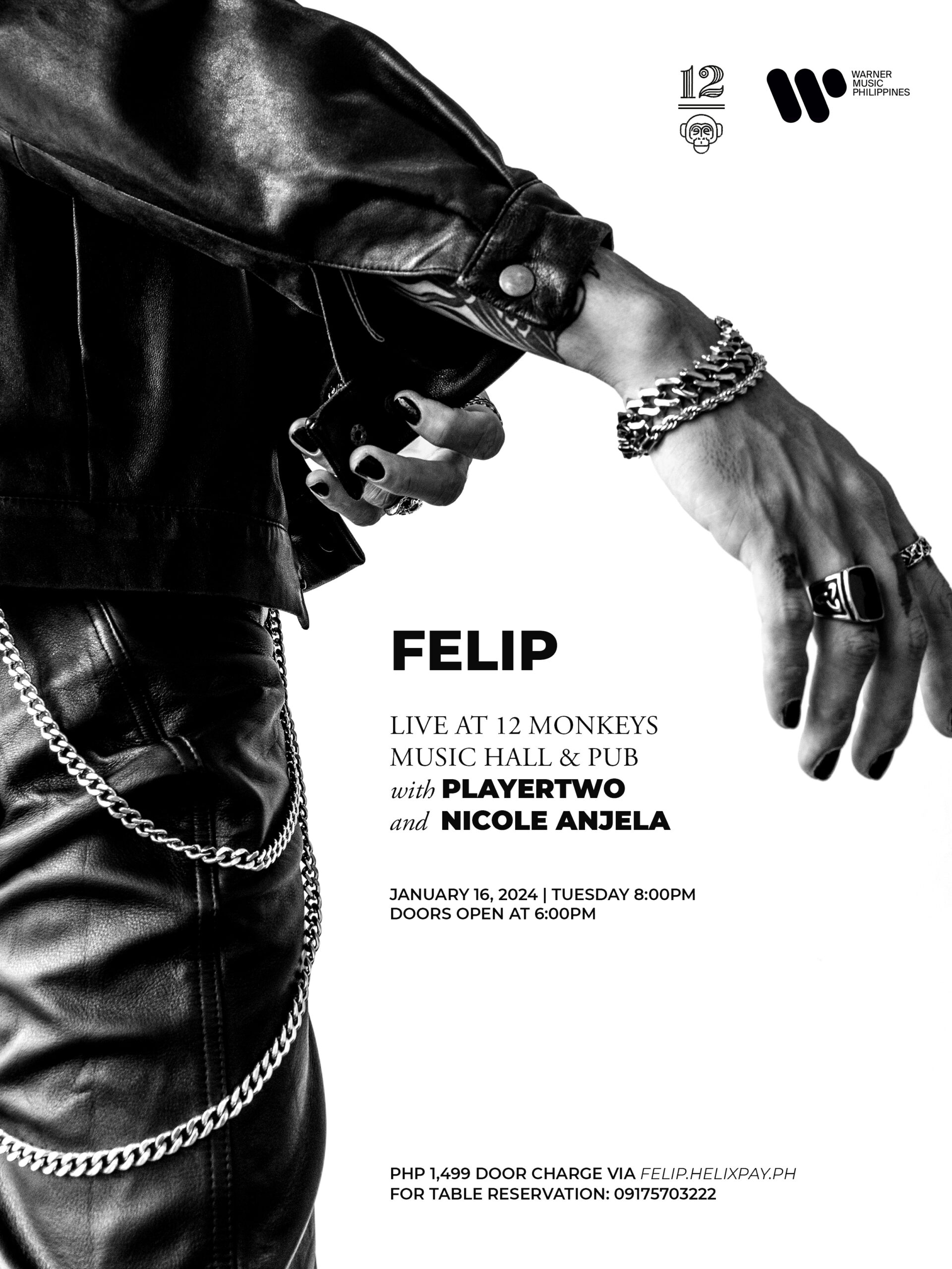 See you on January 16, 2024 at 12 Monkeys Music Hall & Pub, Estancia Mall Capitol Commons, Pasig with PLAYERTWO and Nicole Anjela. Tickets are available via https://felip.helixpay.ph tonight at 8:00pm.