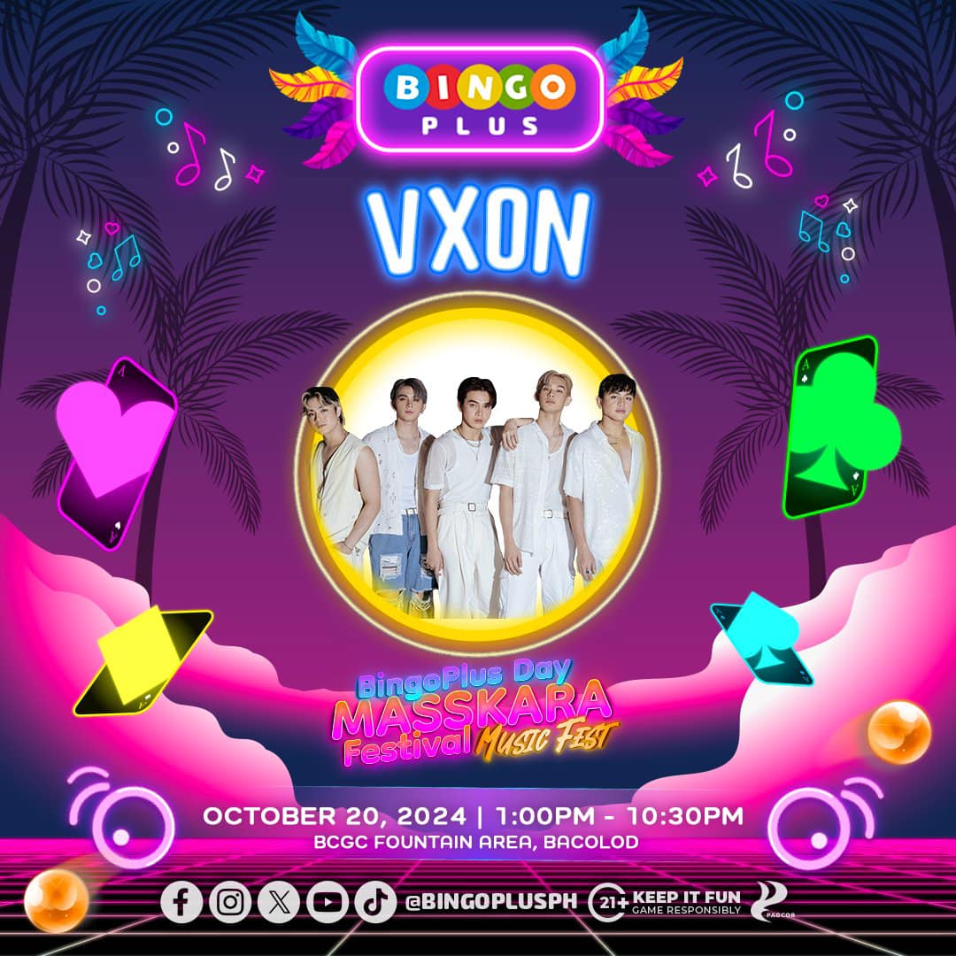BingoPlus Day Masskara Music Festival is happening! Samahan kami sa isa sa pinakamalaking music fest sa Bacolod kasama ang inyong mga paboritong artists and PPOP group na YML, G22 and VXON. Get ready to be serenaded by the biggest stars in the entertainment industry! ✨